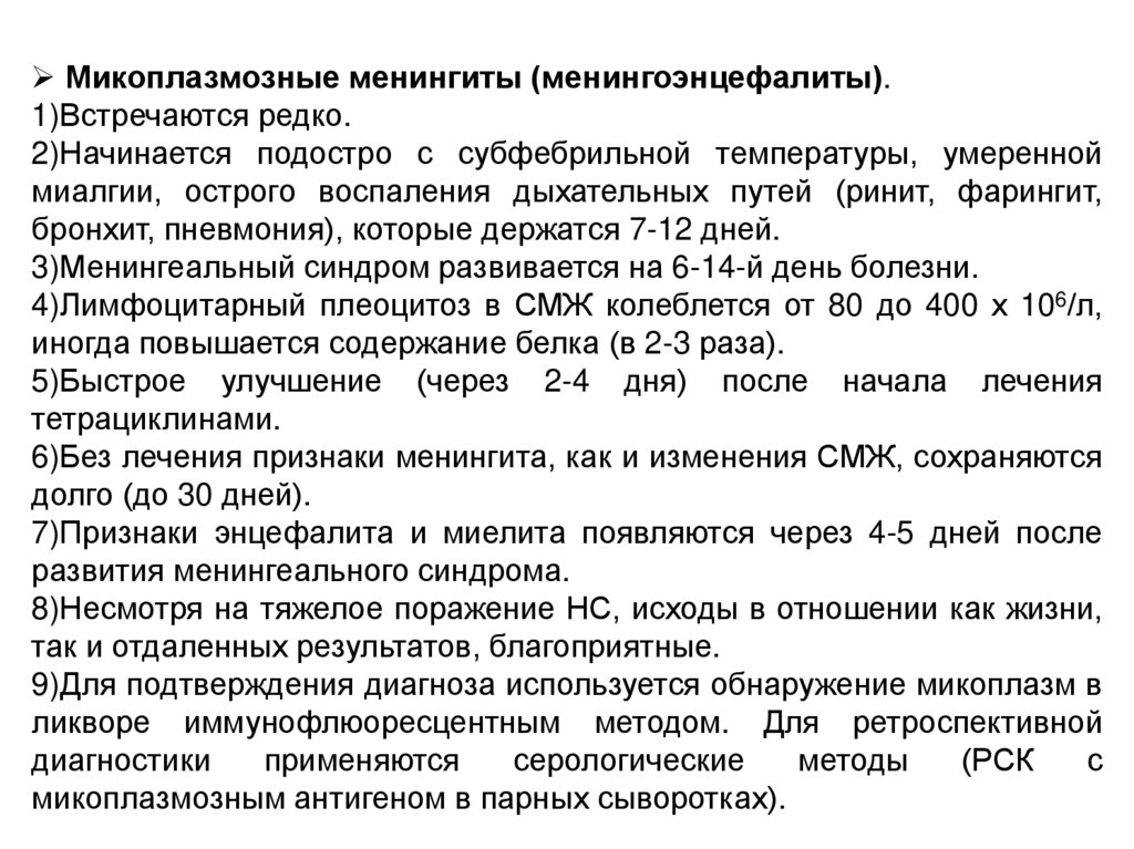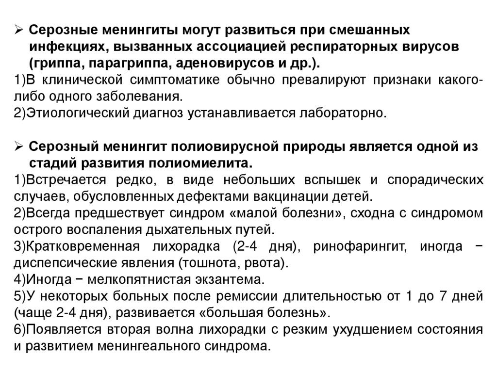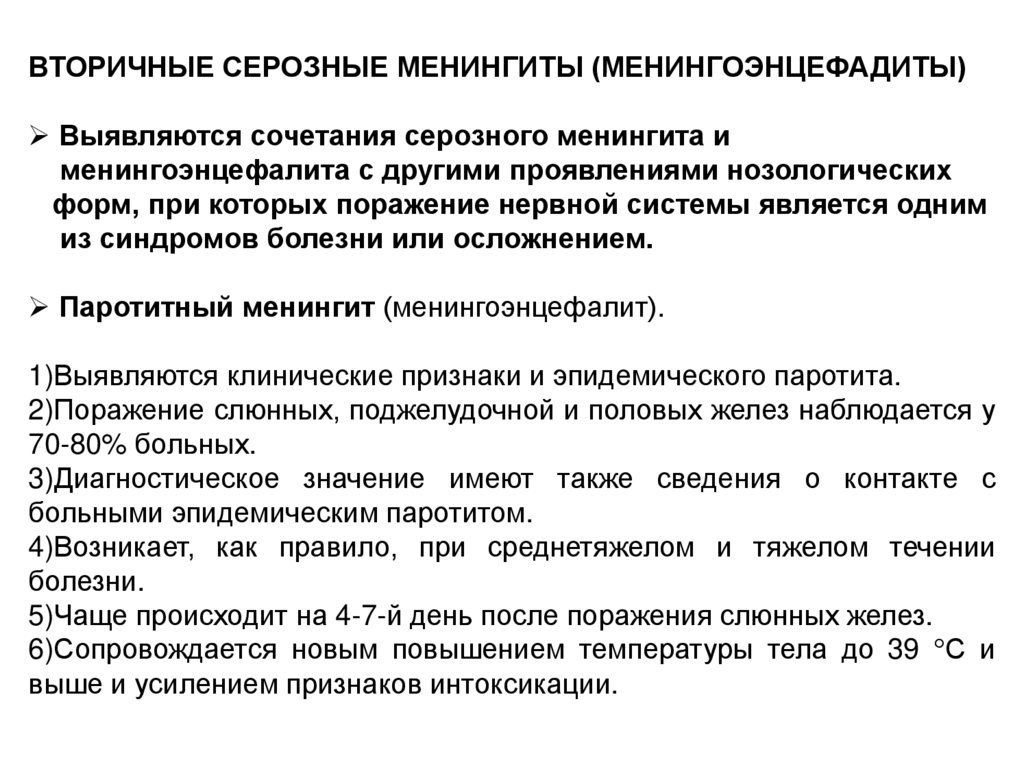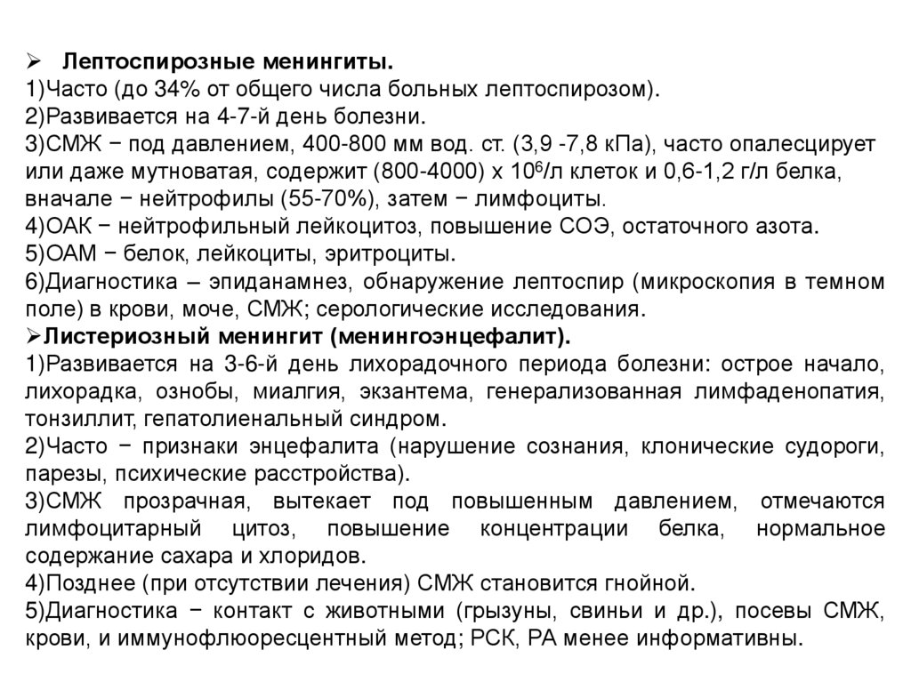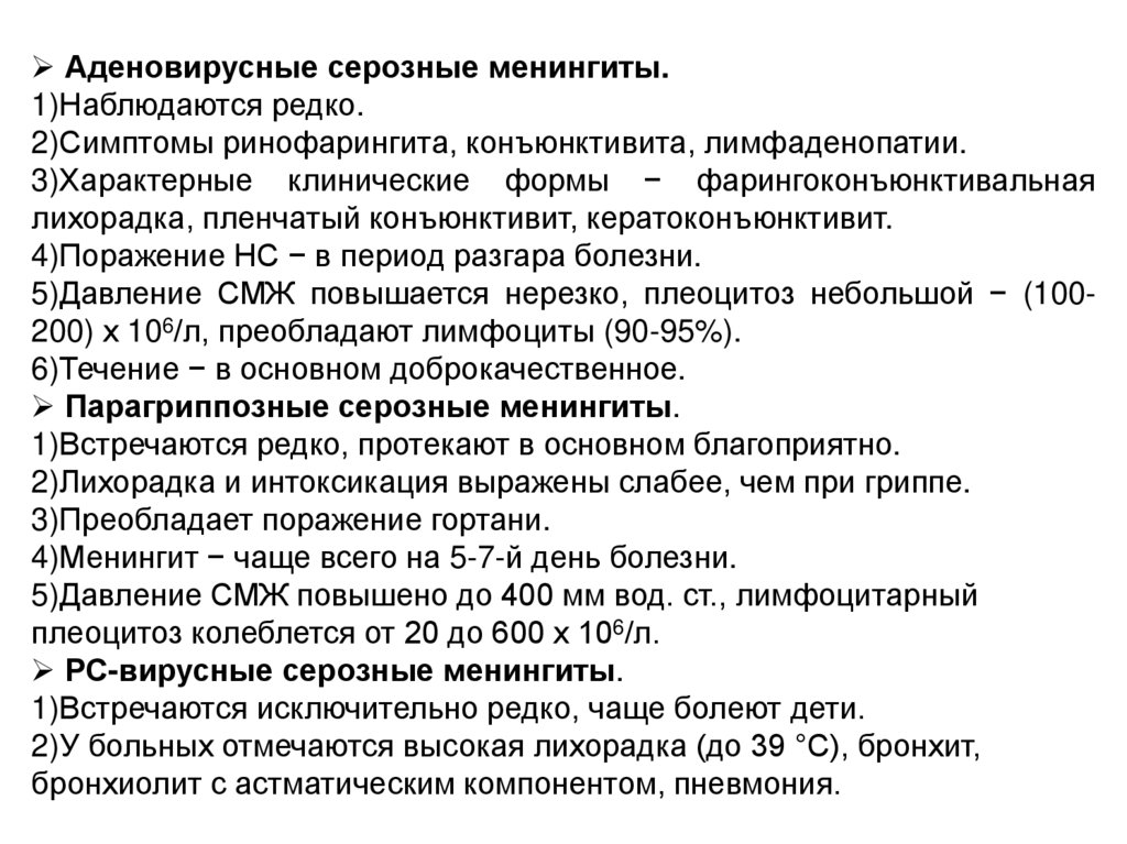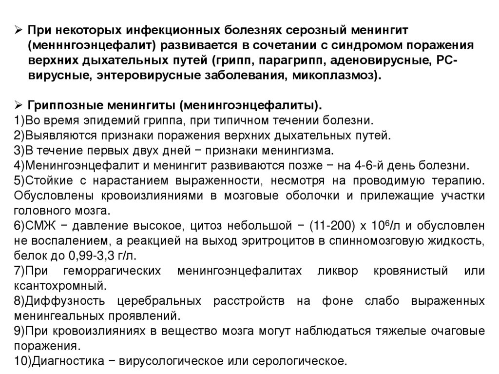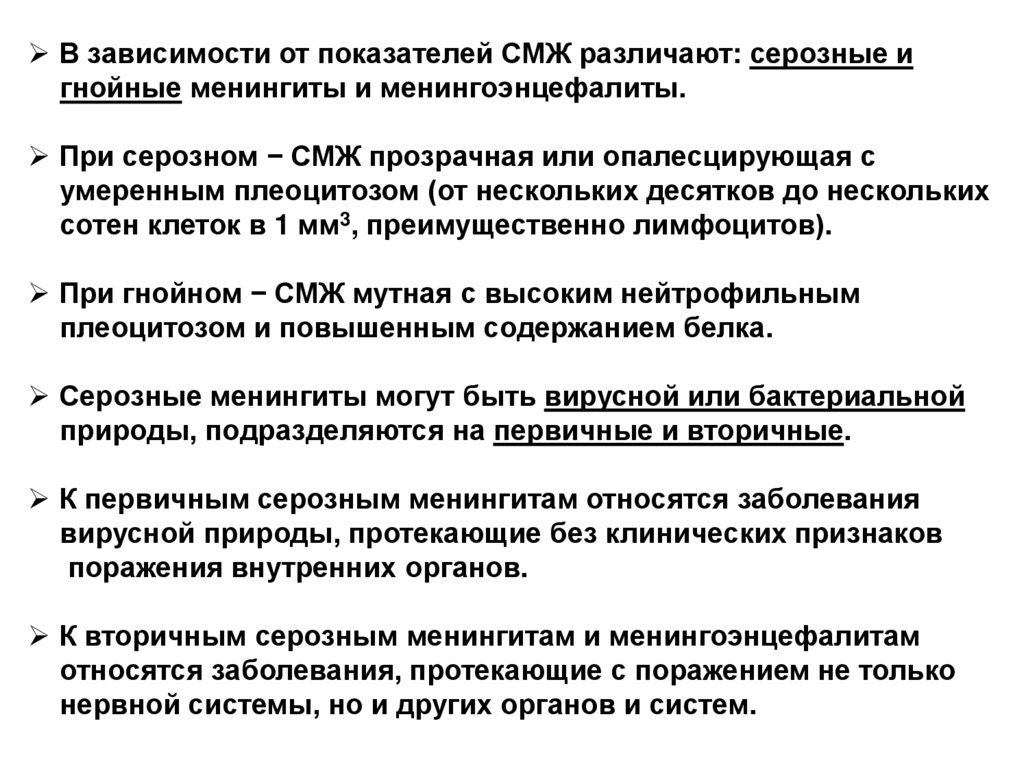 В зависимости от показателей СМЖ различают: серозные игнойные менингиты и менингоэнцефалиты.