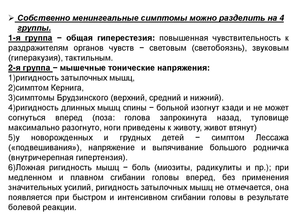Собственно менингеальные симптомы можно разделить на 4группы.