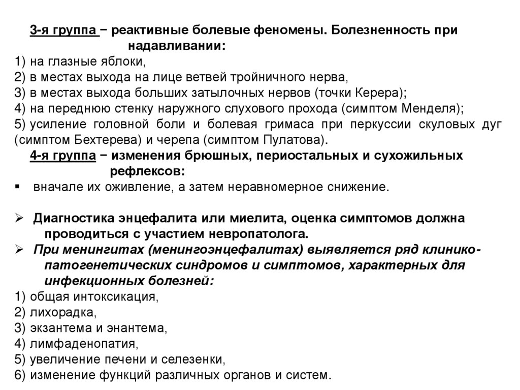 При менингитах (менингоэнцефалитах) выявляется ряд клиникопатогенетических синдромов и симптомов, характерных для