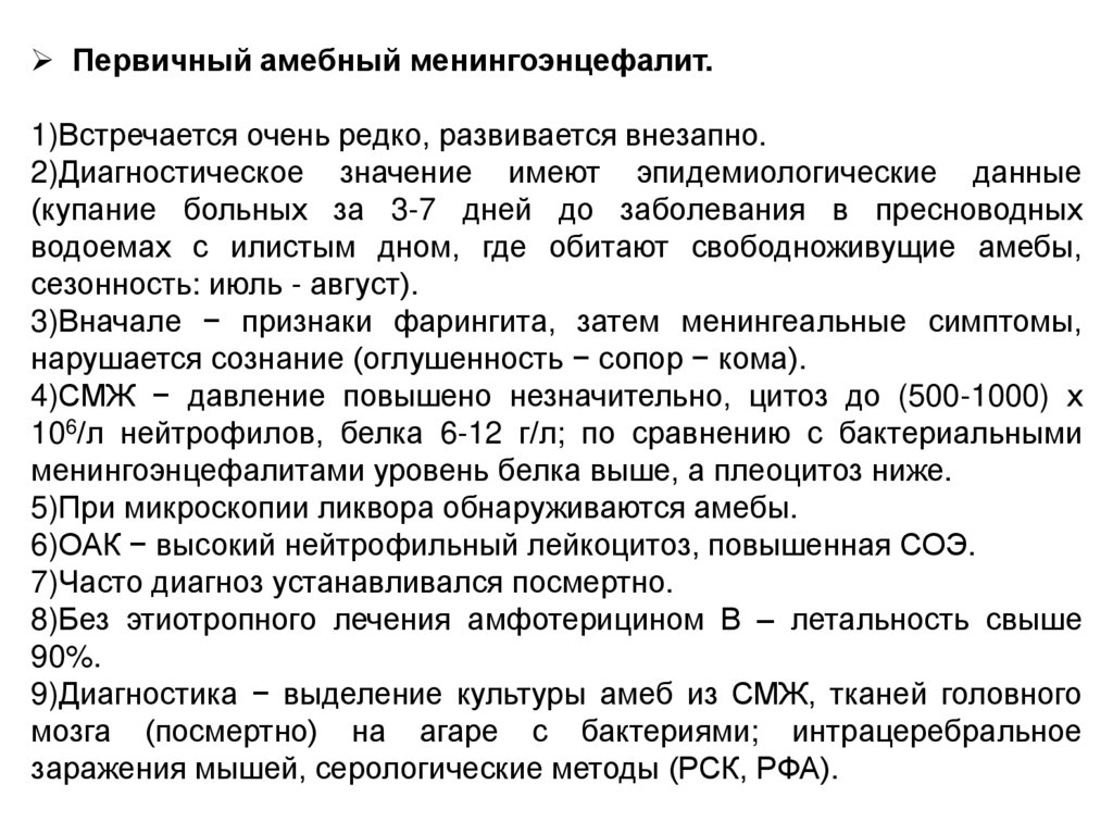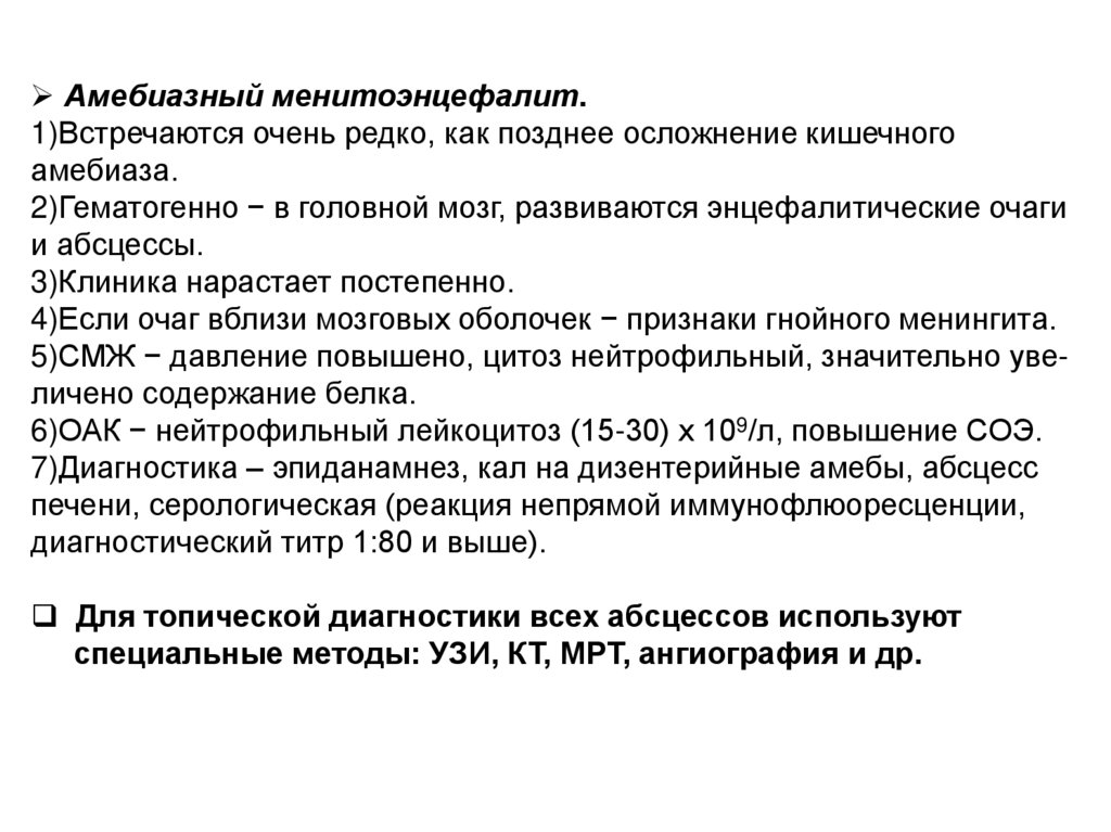 Амебиазный менитоэнцефалит.1)Встречаются очень редко, как позднее осложнение кишечного