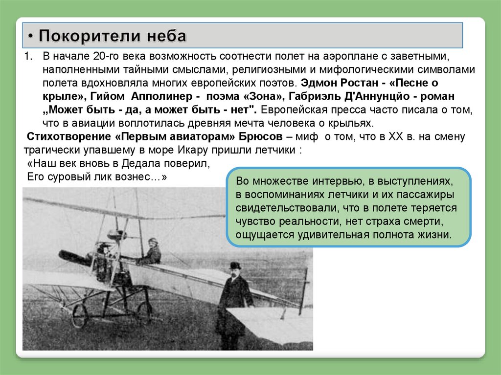 1. В начале 20-го века возможность соотнести полет на аэроплане с заветными,наполненными тайными смыслами, религиозными и мифологическими символами