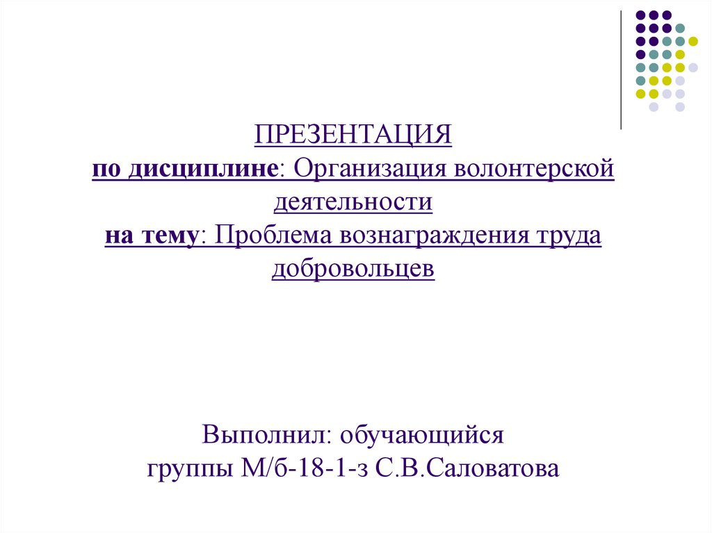 1. ПРЕЗЕНТАЦИЯ по дисциплине: Организация волонтерской деятельности на тему: Проблема вознаграждения труда добровольцев Выполнил: