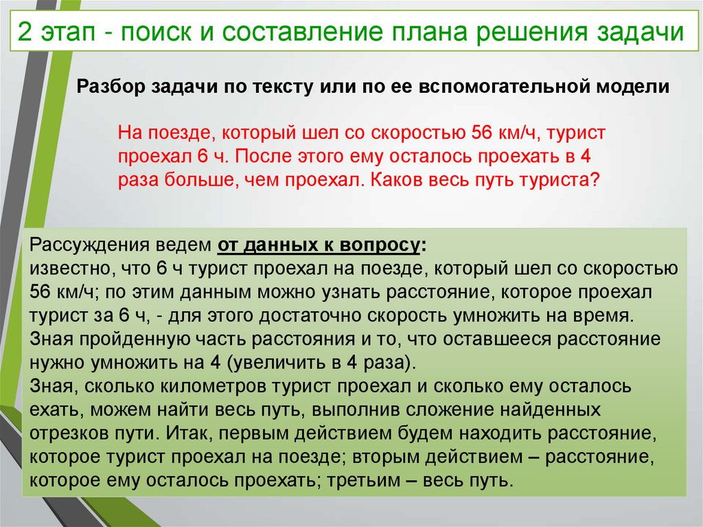 2 этап - поиск и составление плана решения задачиРазбор задачи по тексту или по ее вспомогательной модели