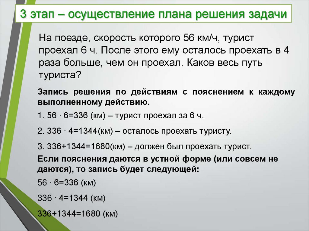 3 этап – осуществление плана решения задачиНа поезде, скорость которого 56 км/ч, турист