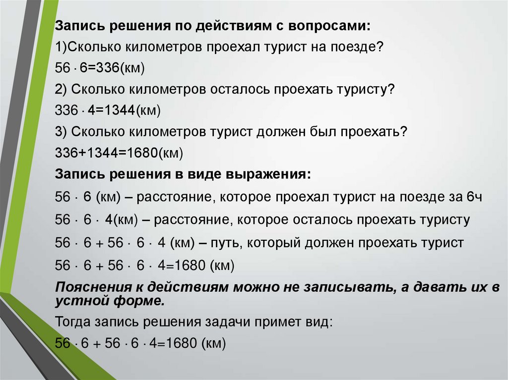 Запись решения по действиям с вопросами:1)Сколько километров проехал турист на поезде?