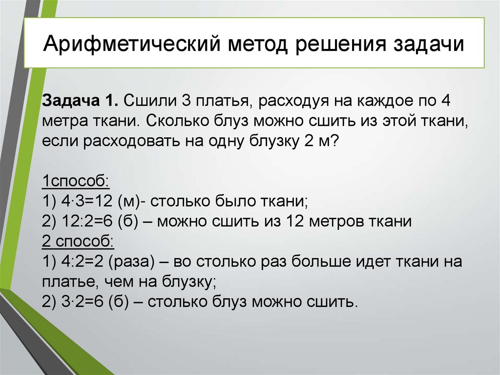 Арифметический метод решения задачиЗадача 1. Сшили 3 платья, расходуя на каждое по 4