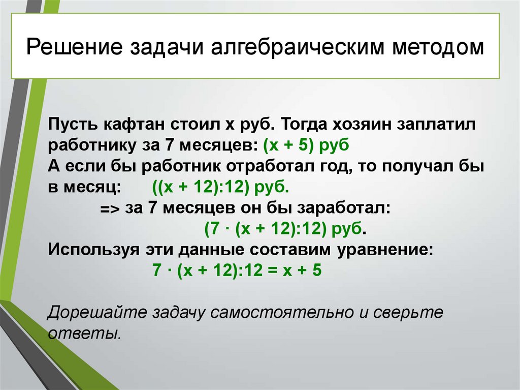 Решение задачи алгебраическим методомПусть кафтан стоил x руб. Тогда хозяин заплатил