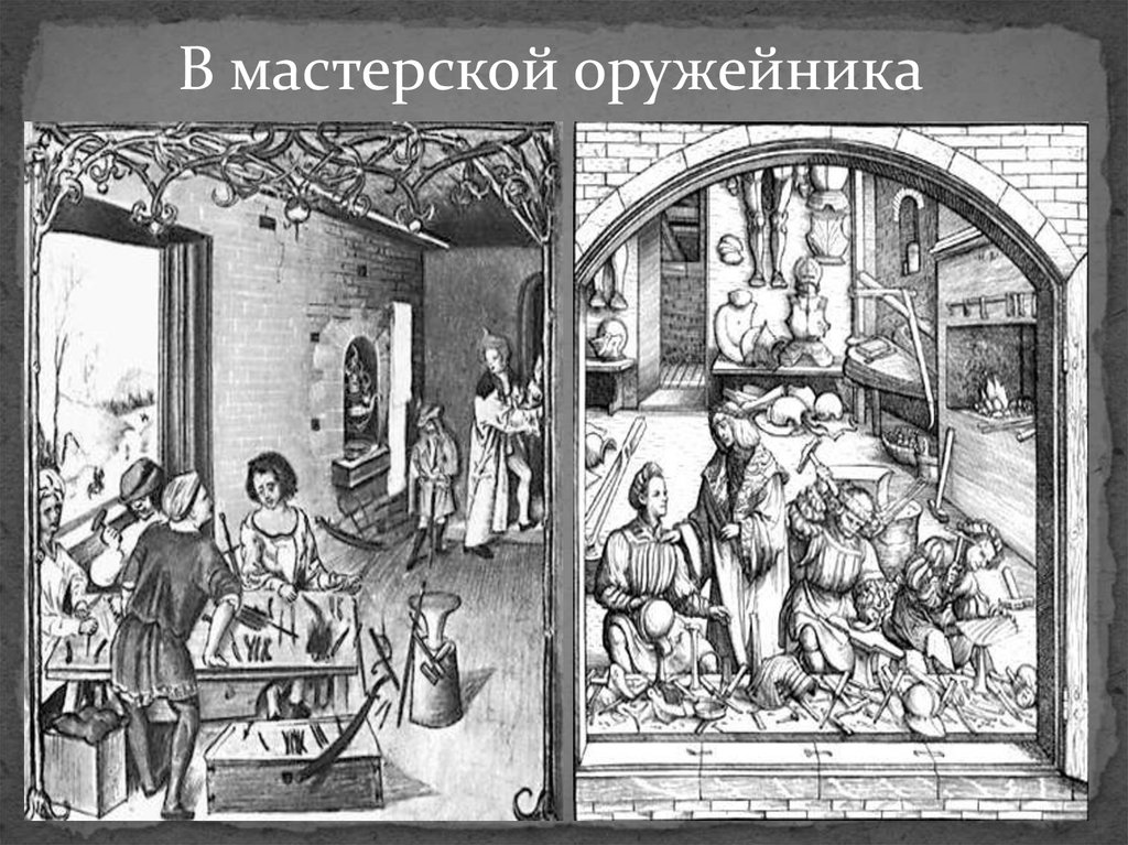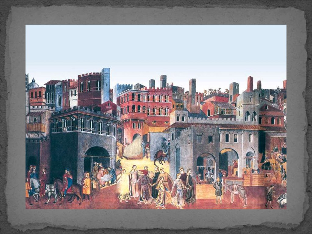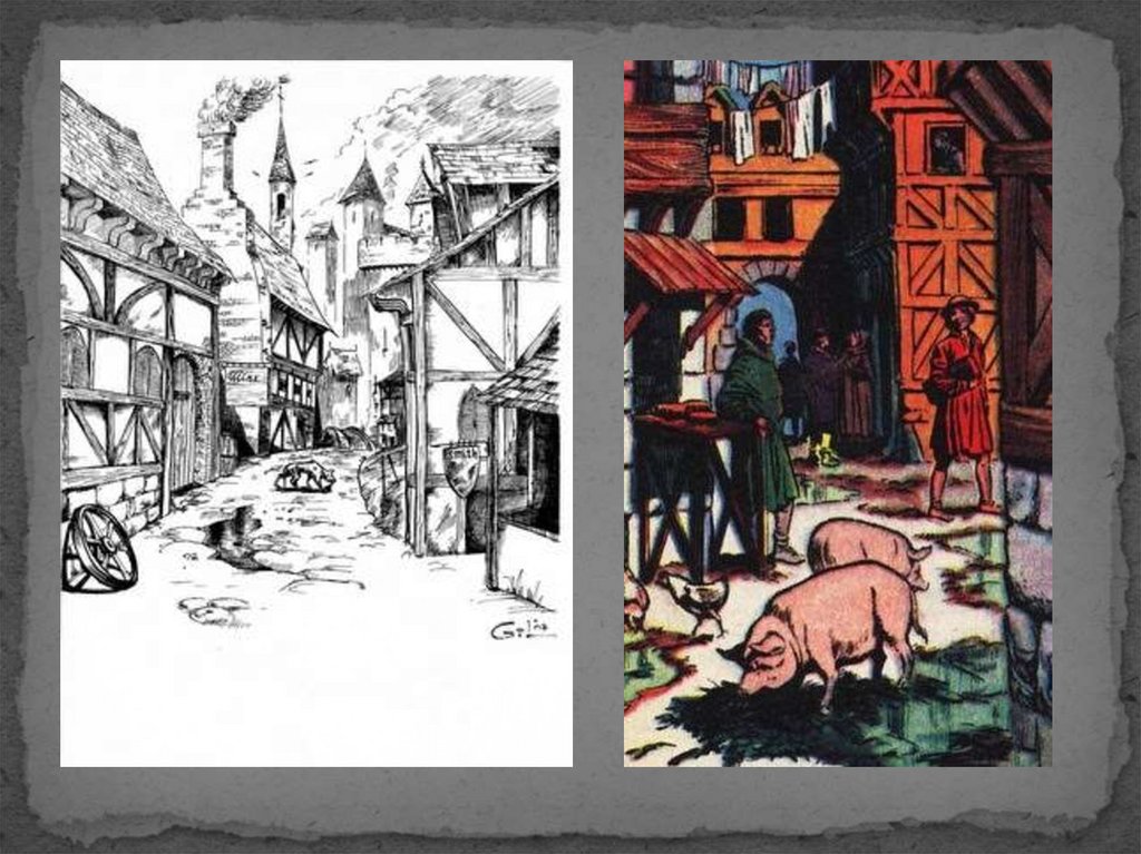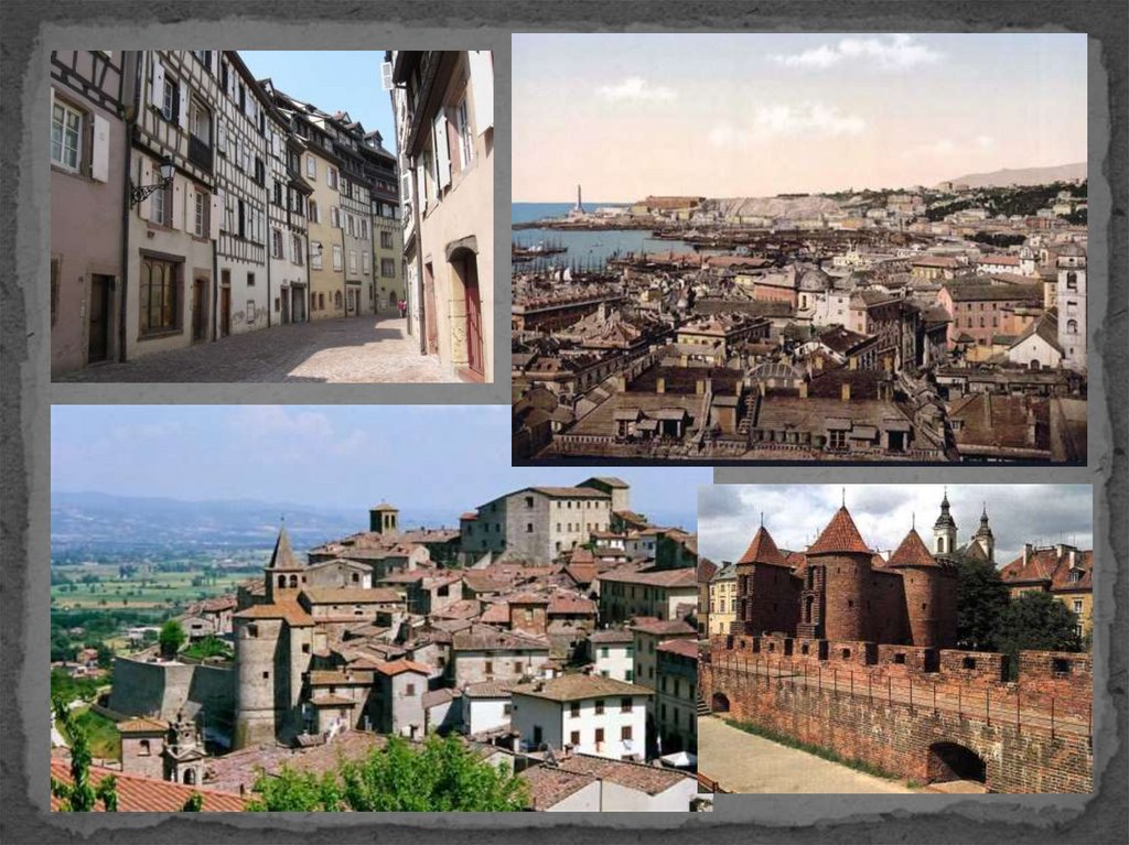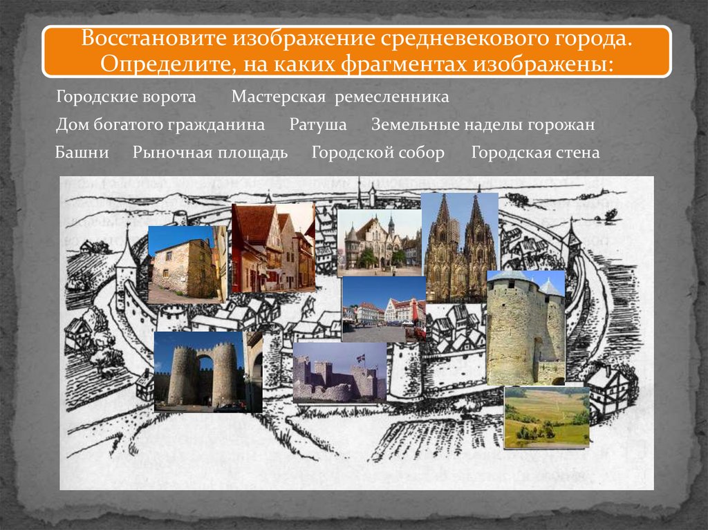 Восстановите изображение средневекового города.Определите, на каких фрагментах изображены: