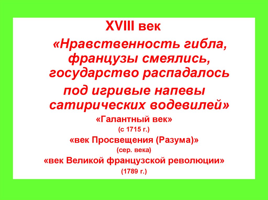 XVIII век. «Нравственность гибла, французы смеялись, государство распадалось под игривые напевы сатирических водевилей»