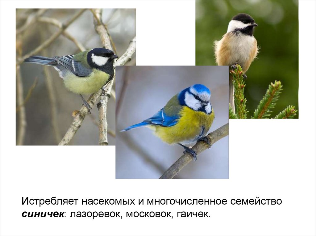 Истребляет насекомых и многочисленное семействосиничек: лазоревок, московок, гаичек.