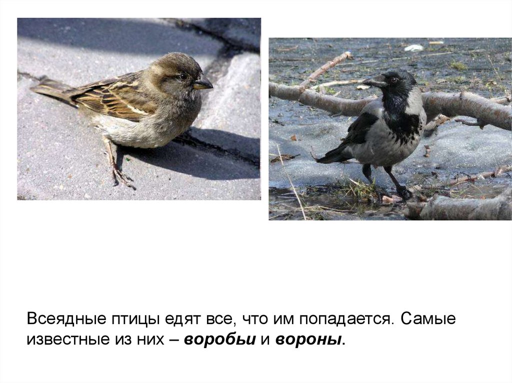 Всеядные птицы едят все, что им попадается. Самыеизвестные из них – воробьи и вороны.