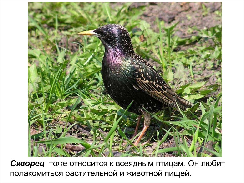 Скворец тоже относится к всеядным птицам. Он любитполакомиться растительной и животной пищей.