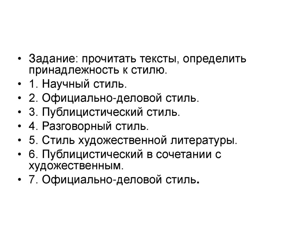 • Задание: прочитать тексты, определитьпринадлежность к стилю.