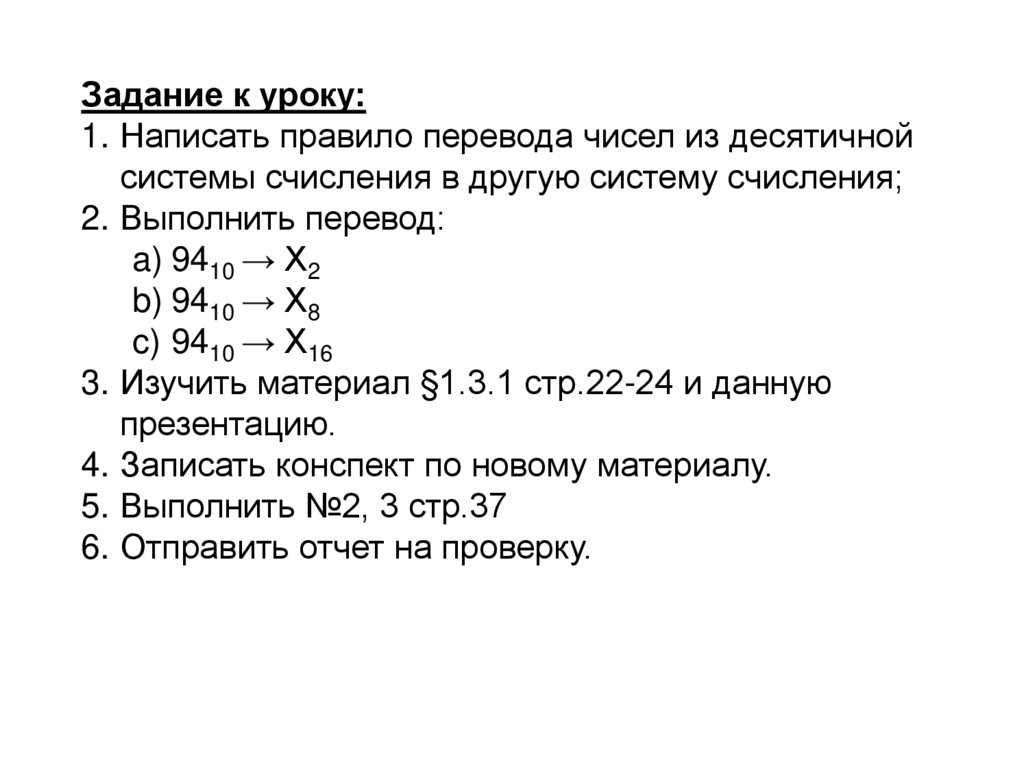 Задание к уроку:1. Написать правило перевода чисел из десятичной