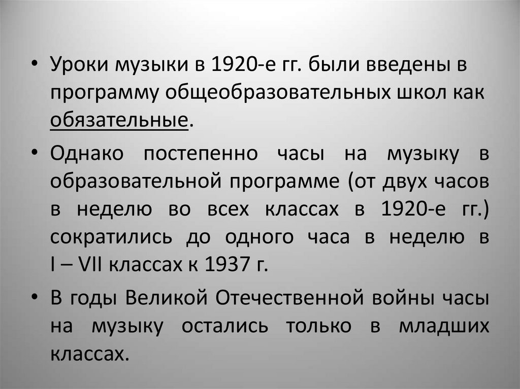 • Уроки музыки в 1920-е гг. были введены впрограмму общеобразовательных школ как