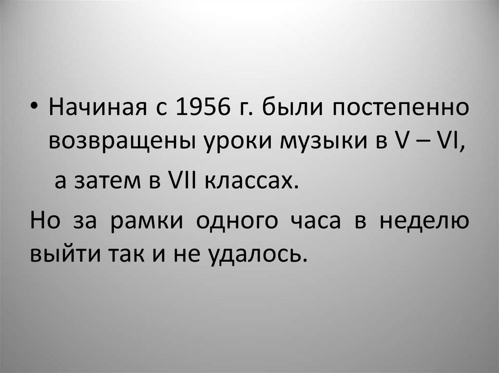• Начиная с 1956 г. были постепенновозвращены уроки музыки в V – VI,