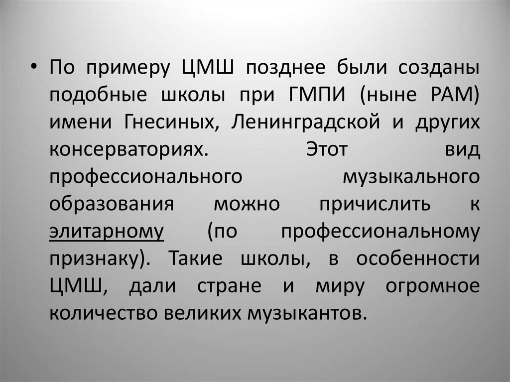 • По примеру ЦМШ позднее были созданыподобные школы при ГМПИ (ныне РАМ)