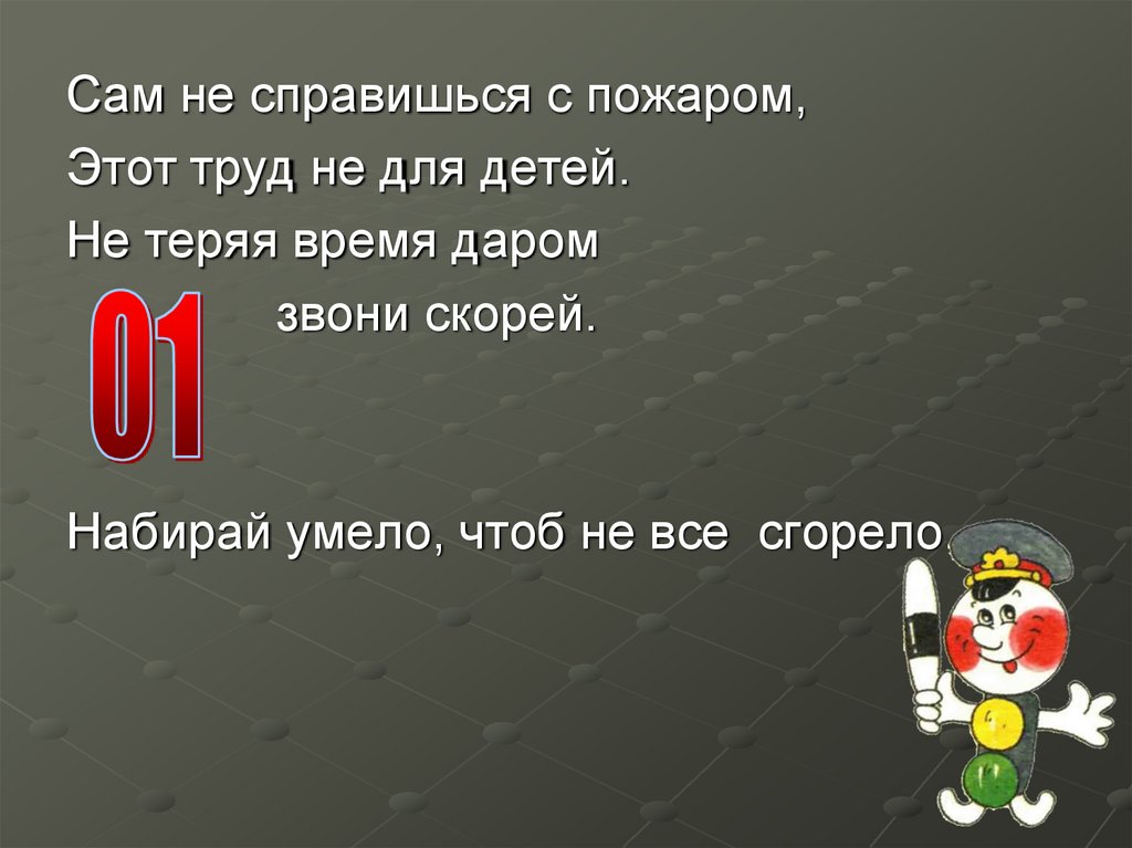 Сам не справишься с пожаром,Этот труд не для детей.
