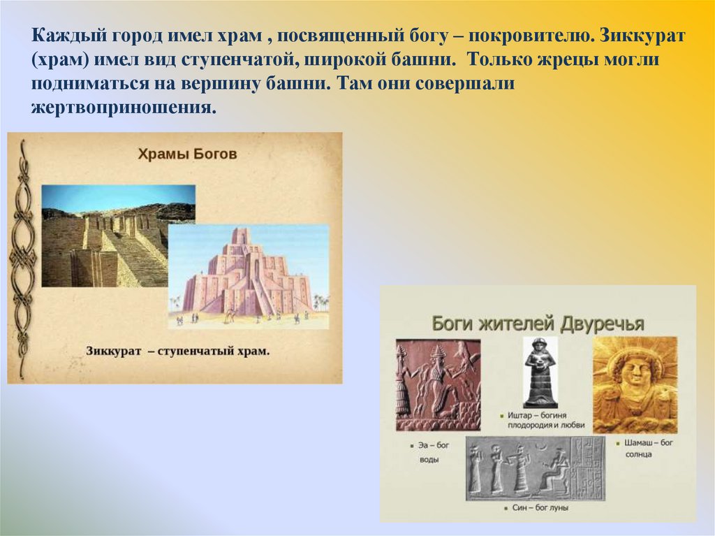 Каждый город имел храм , посвященный богу – покровителю. Зиккурат(храм) имел вид ступенчатой, широкой башни. Только жрецы могли