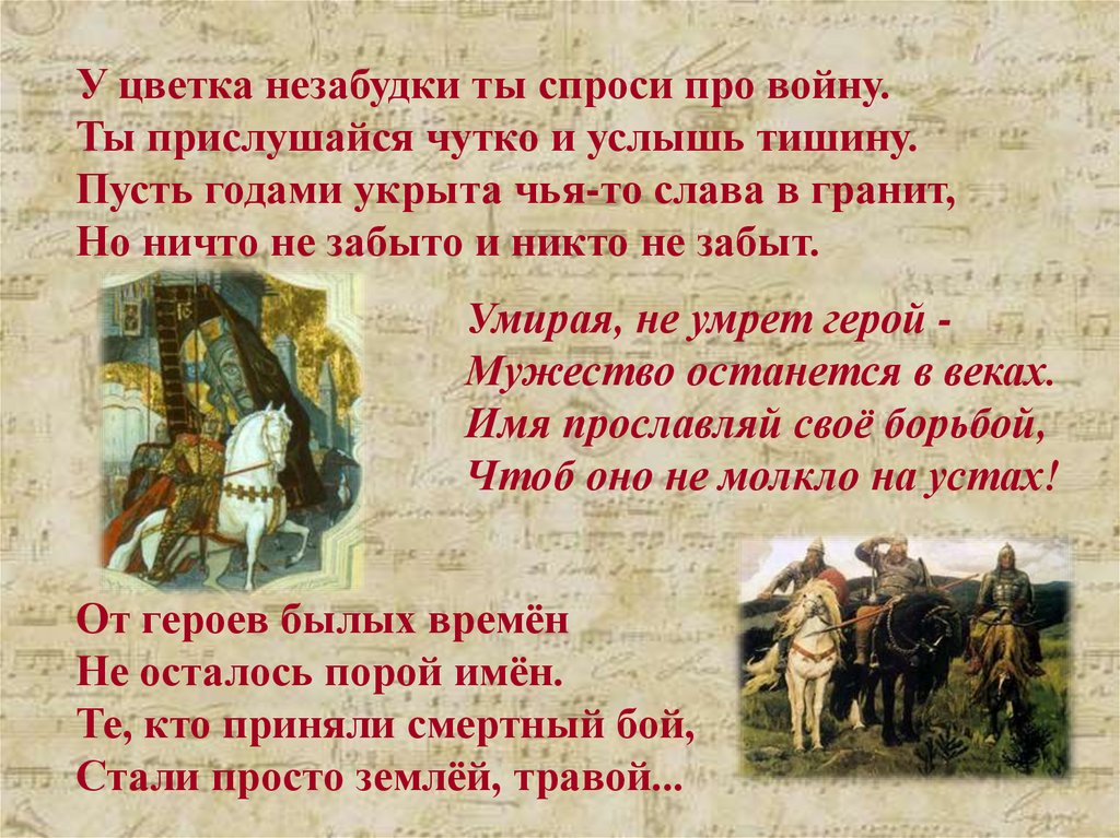 От героев былых времен не осталось порой имен.Те, кто приняли трудный бой, стали просто землей и травой.
