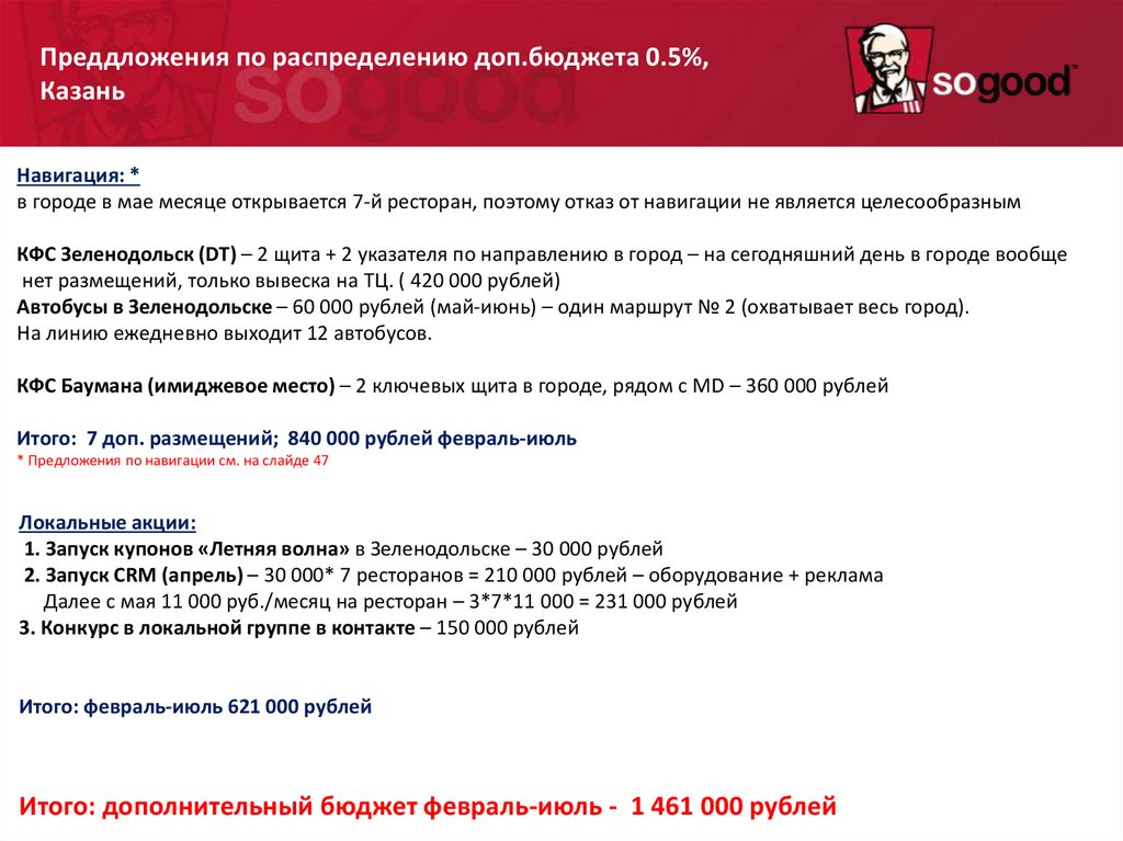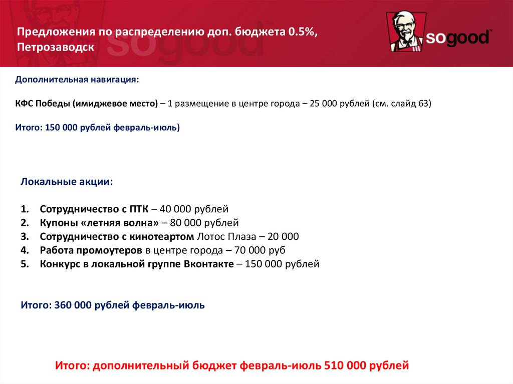 КФС Победы (имиджевое место) – 1 размещение в центре города – 25 000 рублей (см. слайд 63)