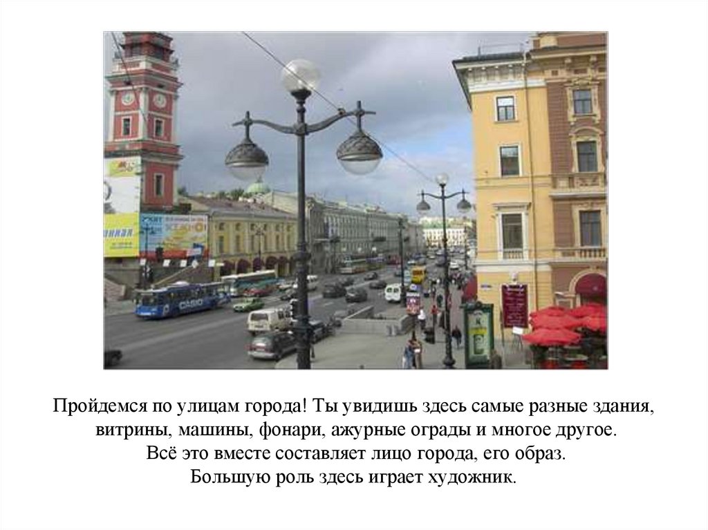 Пройдемся по улицам города! Ты увидишь здесь самые разные здания,витрины, машины, фонари, ажурные ограды и многое другое.
