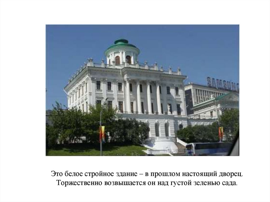 Это белое стройное здание – в прошлом настоящий дворец.Торжественно возвышается он над густой зеленью сада.