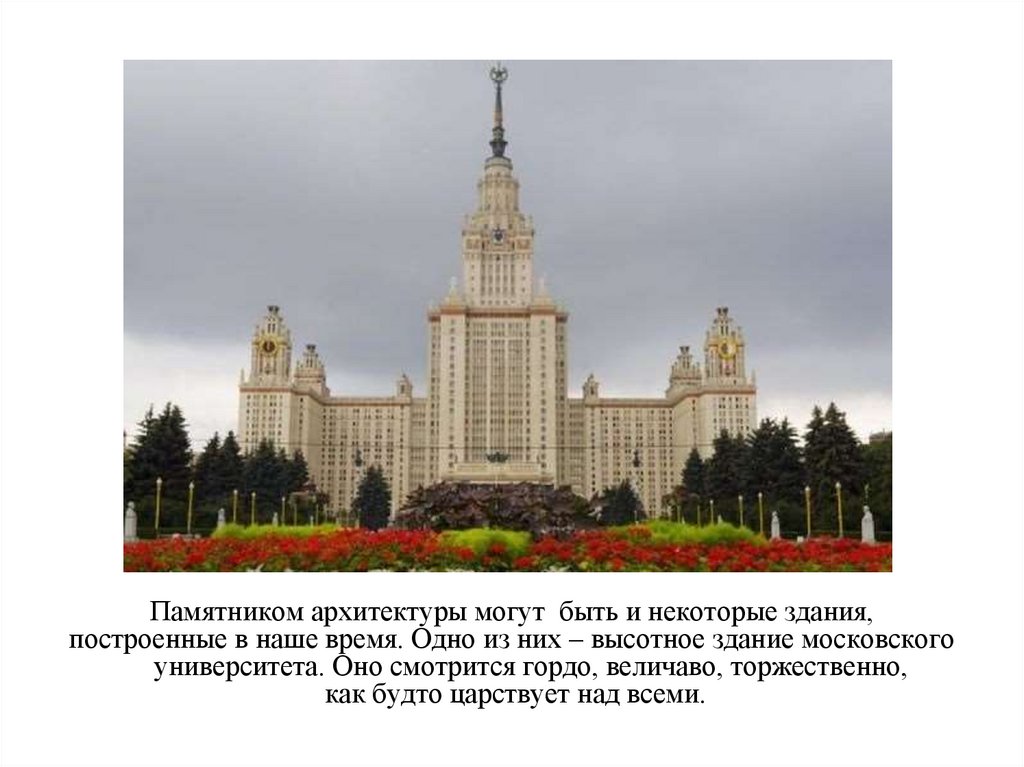 Памятником архитектуры могут быть и некоторые здания,построенные в наше время. Одно из них – высотное здание московского