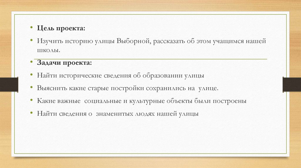 • Цель проекта:• Изучить историю улицы Выборной, рассказать об этом учащимся нашей