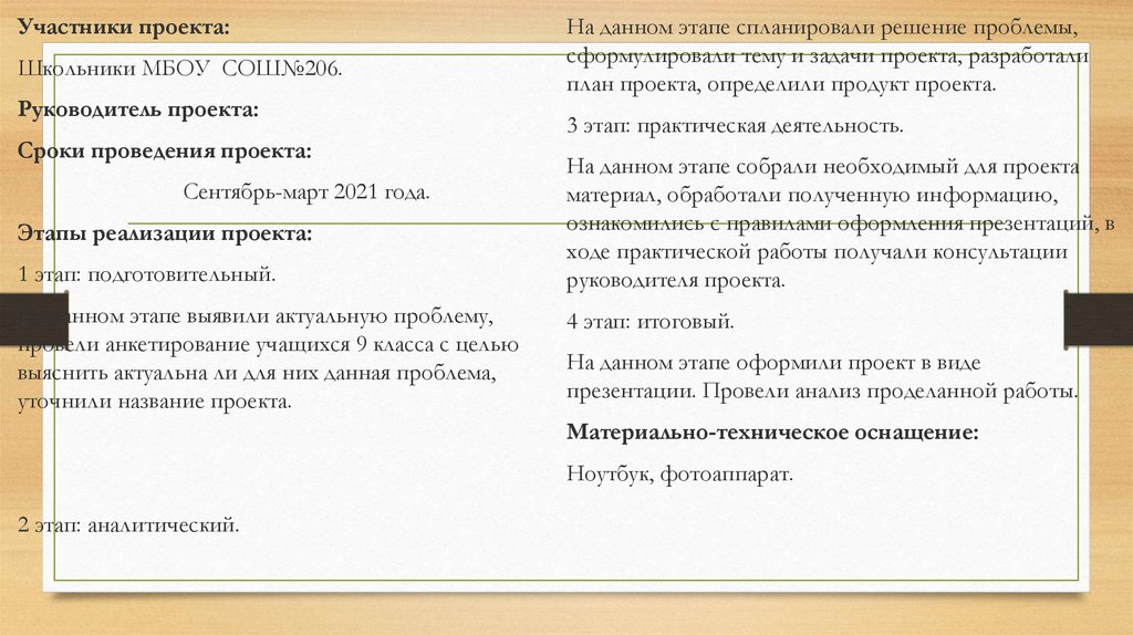 • Определение темы проекта, поиск и анализ проблемы, постановка цели проекта,выбор названия проекта;