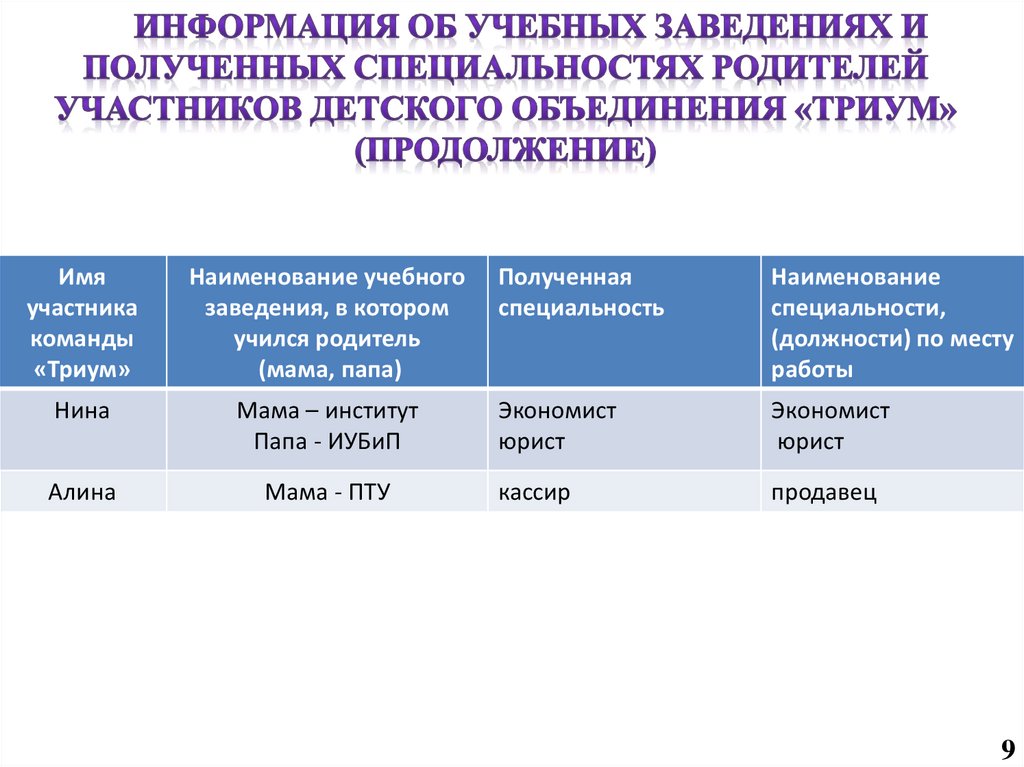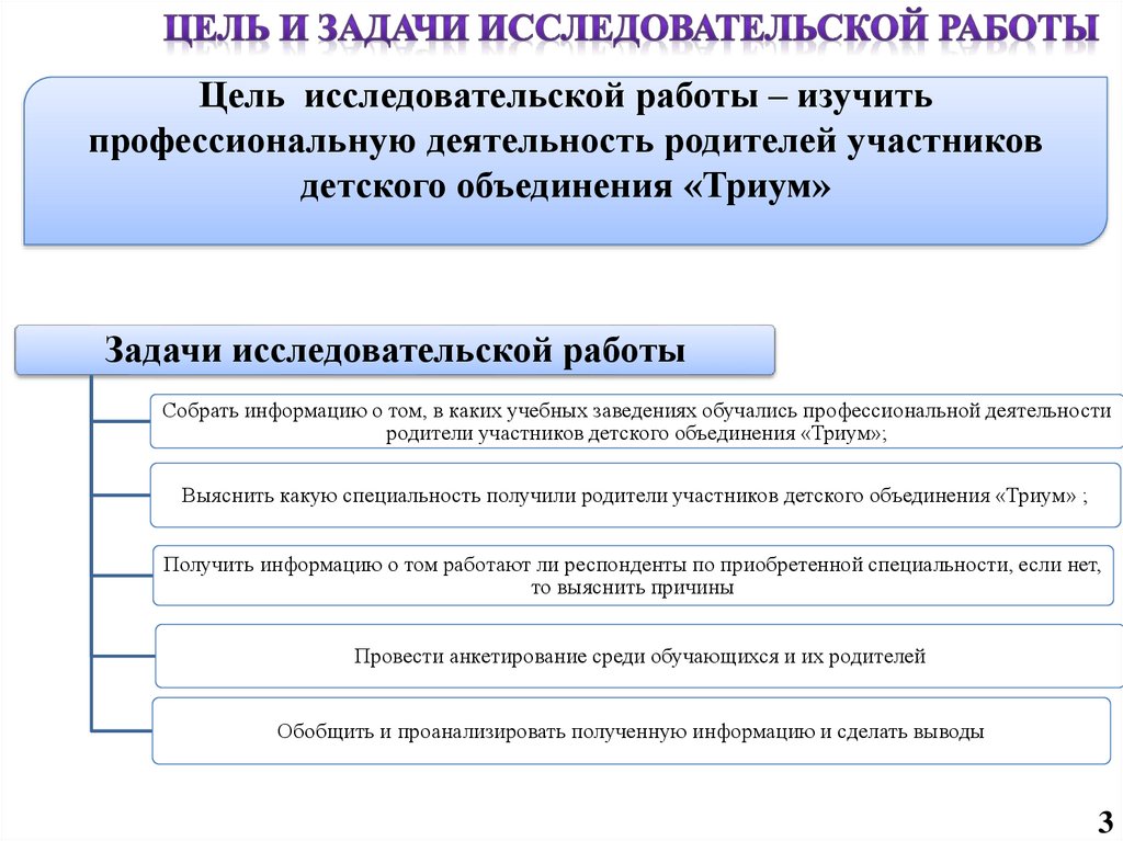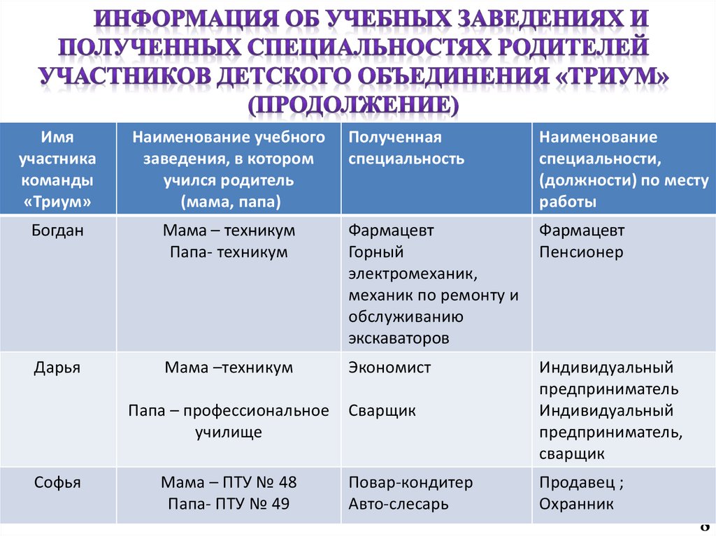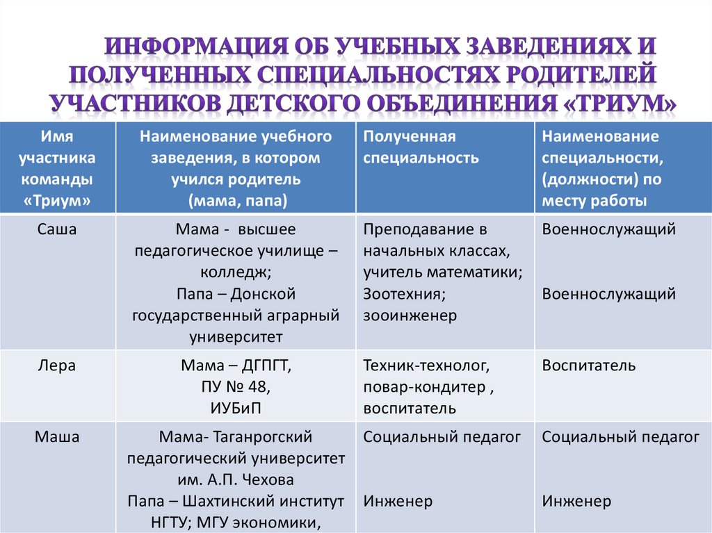 Выяснить какую специальность получили родители участников детского объединения «Триум» ;