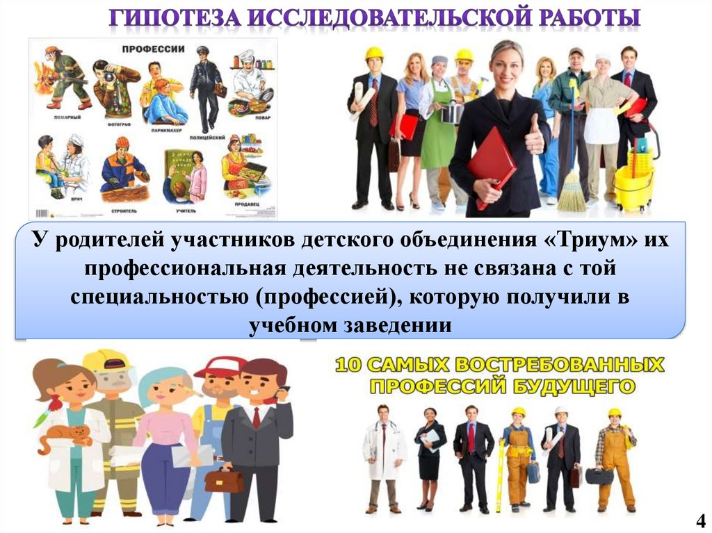 Цель исследовательской работы – изучитьпрофессиональную деятельность родителей участников