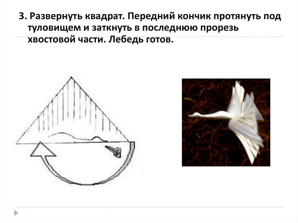 3. Развернуть квадрат. Передний кончик протянуть подтуловищем и заткнуть в последнюю прорезь