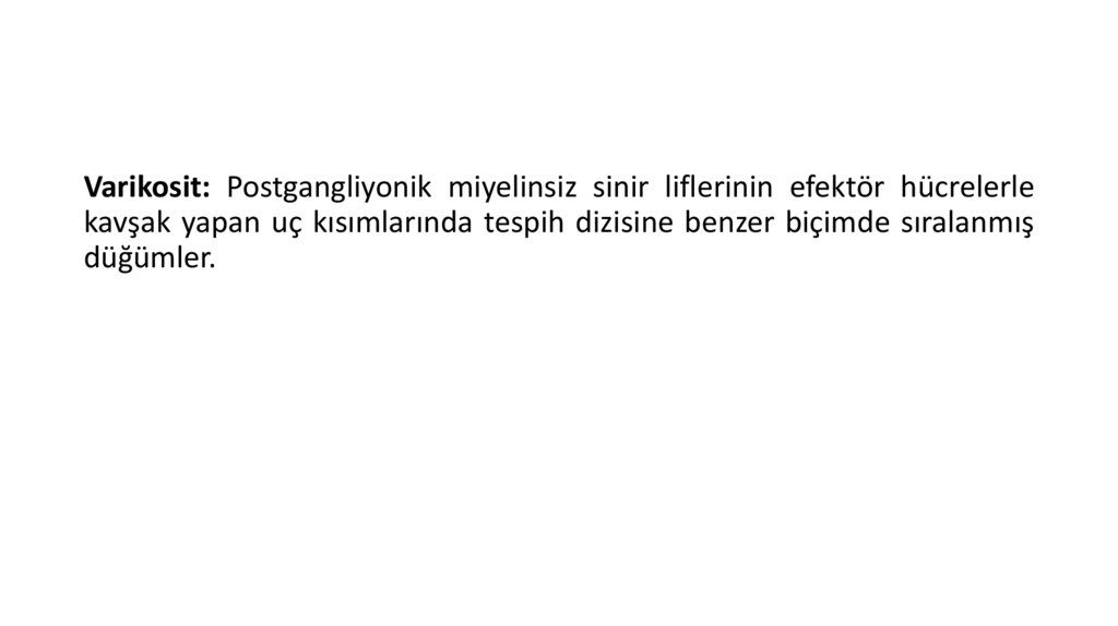 Varikosit: Postgangliyonik miyelinsiz sinir liflerinin efektör hücrelerlekavşak yapan uç kısımlarında tespih dizisine benzer biçimde sıralanmış