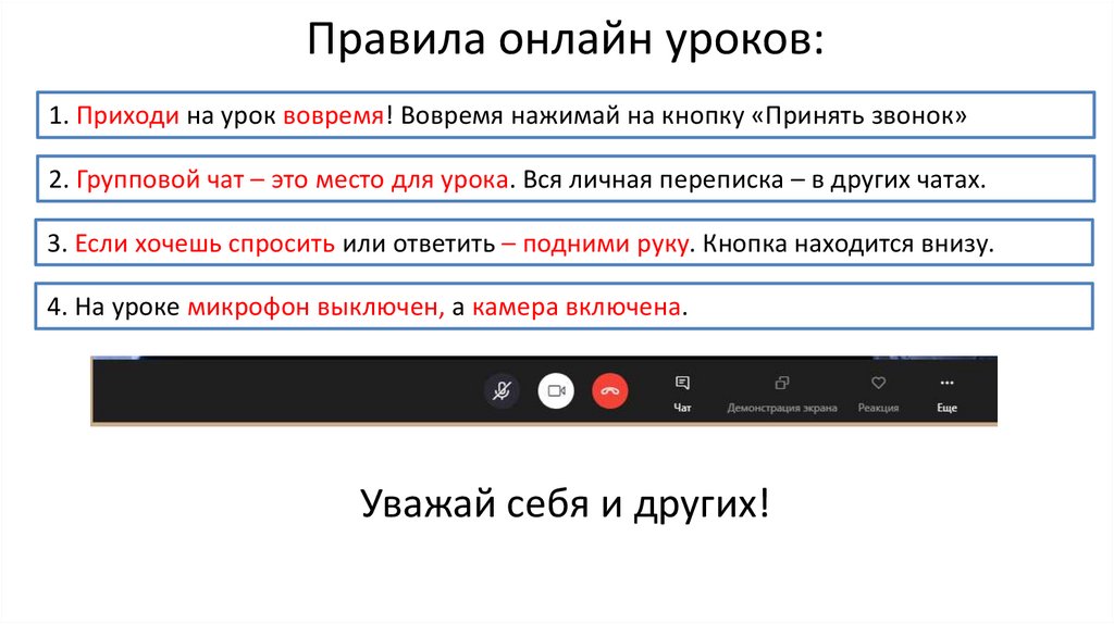 1. Приходи на урок вовремя! Вовремя нажимай на кнопку «Принять звонок»2. Групповой чат – это место для урока. Вся личная переписка – в других чатах.