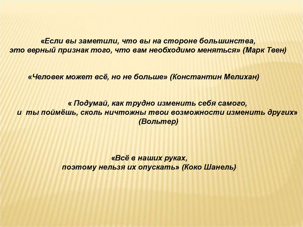 «Если вы заметили, что вы на стороне большинства,это верный признак того, что вам необходимо меняться» (Марк Твен)