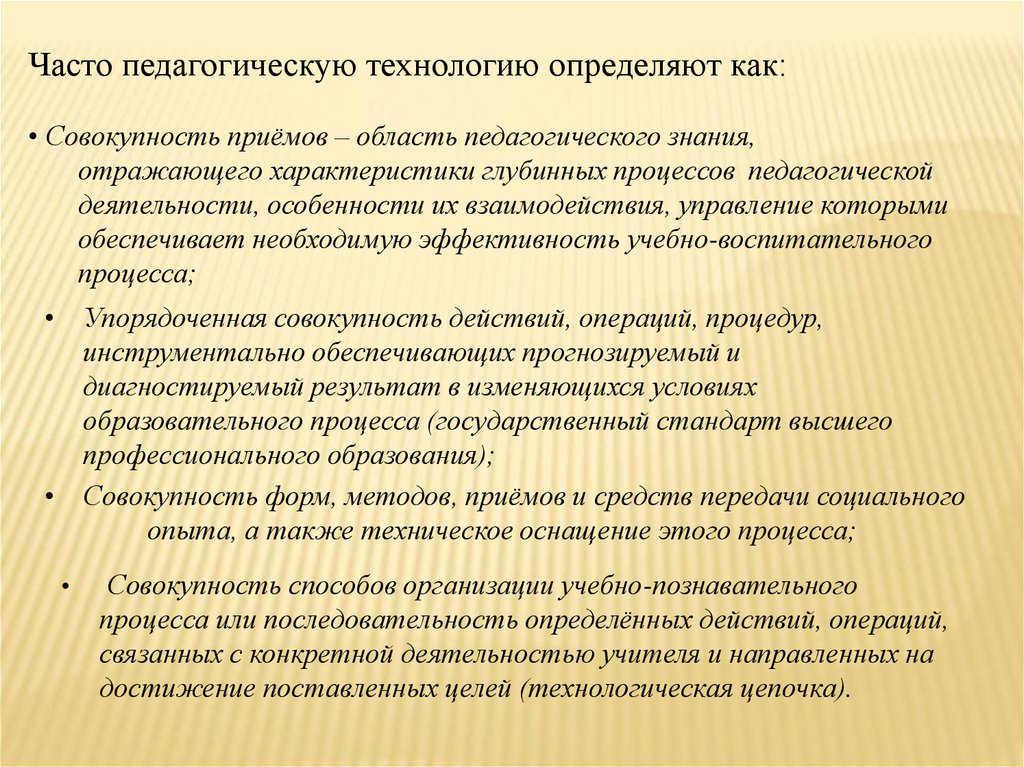 Часто педагогическую технологию определяют как:• Совокупность приёмов – область педагогического знания,