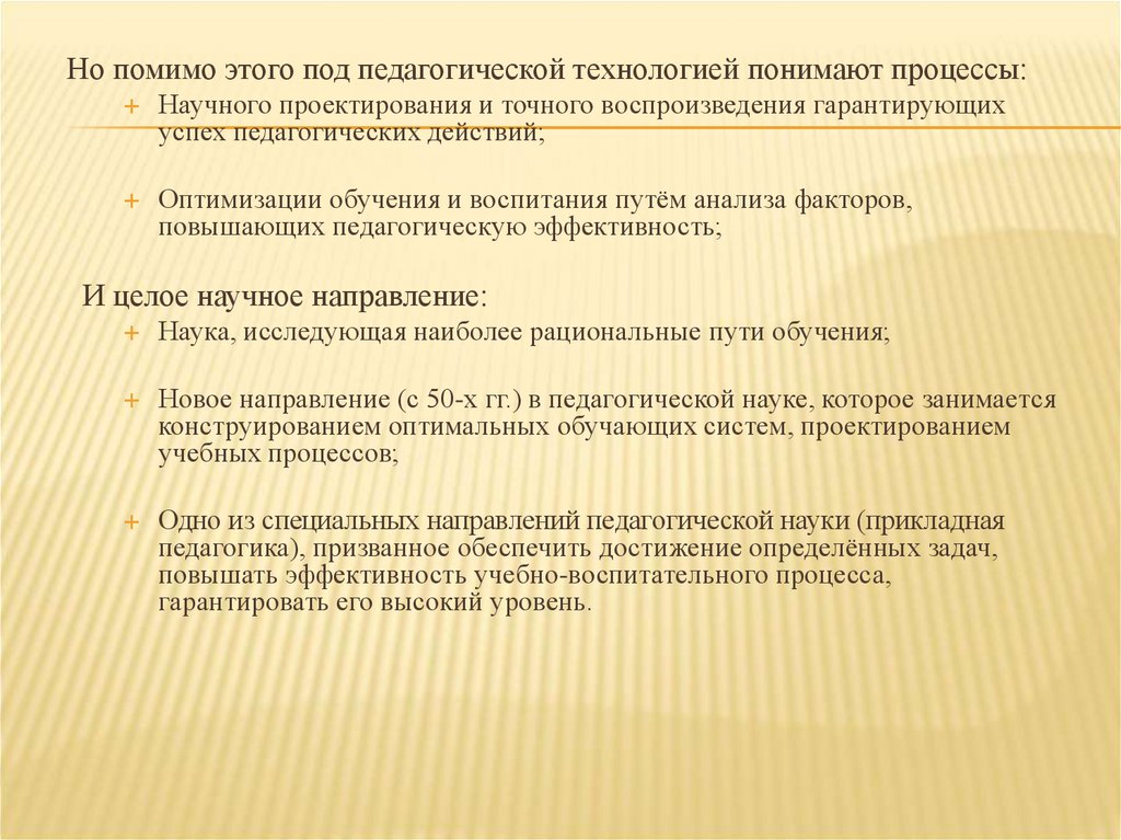 Но помимо этого под педагогической технологией понимают процессы:Научного проектирования и точного воспроизведения гарантирующих