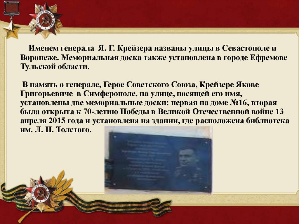 В память о генерале, Герое Советского Союза, Крейзере Якове