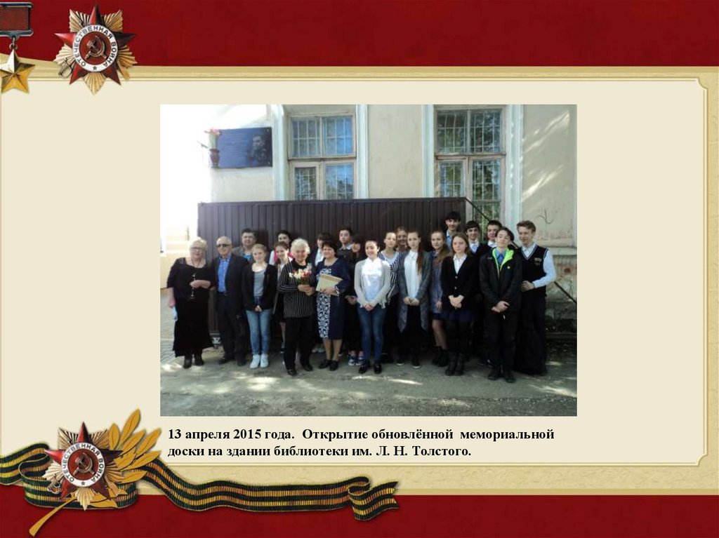 13 апреля 2015 года. Открытие обновлённой мемориальнойдоски на здании библиотеки им. Л. Н. Толстого.
