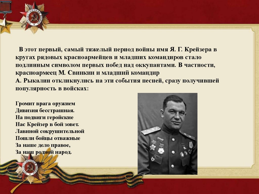 В этот первый, самый тяжелый период войны имя Я. Г. Крейзера вкругах рядовых красноармейцев и младших командиров стало
