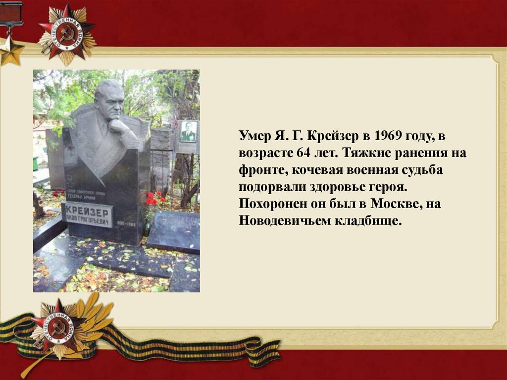 Умер Я. Г. Крейзер в 1969 году, ввозрасте 64 лет. Тяжкие ранения на