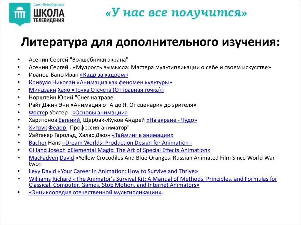 Литература для дополнительного изучения:Асенин Сергей "Волшебники экрана"