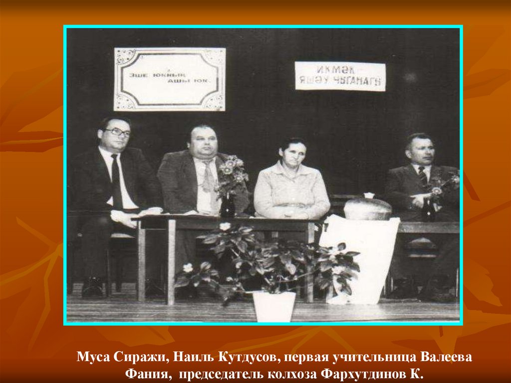 Муса Сиражи, Наиль Кутдусов, первая учительница ВалееваФания, председатель колхоза Фархутдинов К.