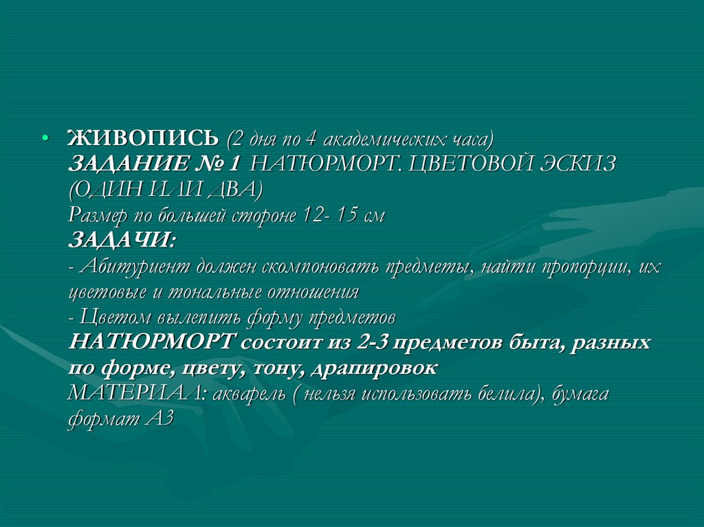 • ЖИВОПИСЬ (2 дня по 4 академических часа)ЗАДАНИЕ № 1 НАТЮРМОРТ. ЦВЕТОВОЙ ЭСКИЗ