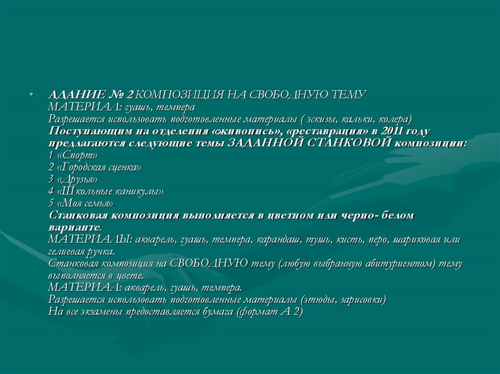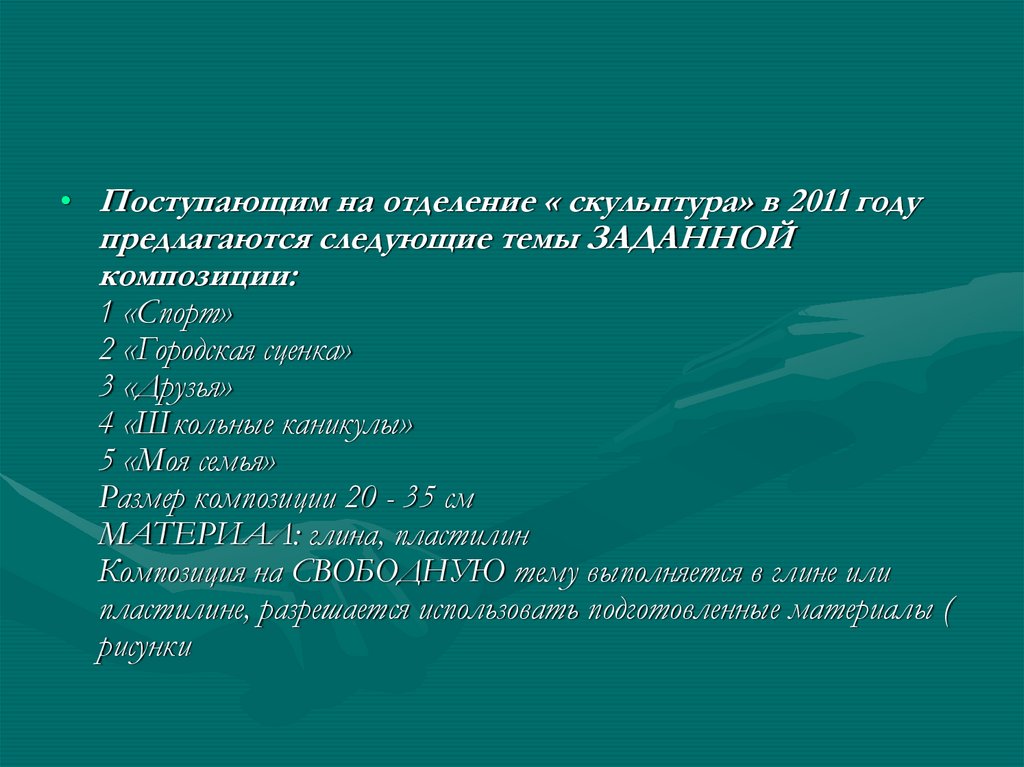 • Поступающим на отделение « скульптура» в 2011 годупредлагаются следующие темы ЗАДАННОЙ