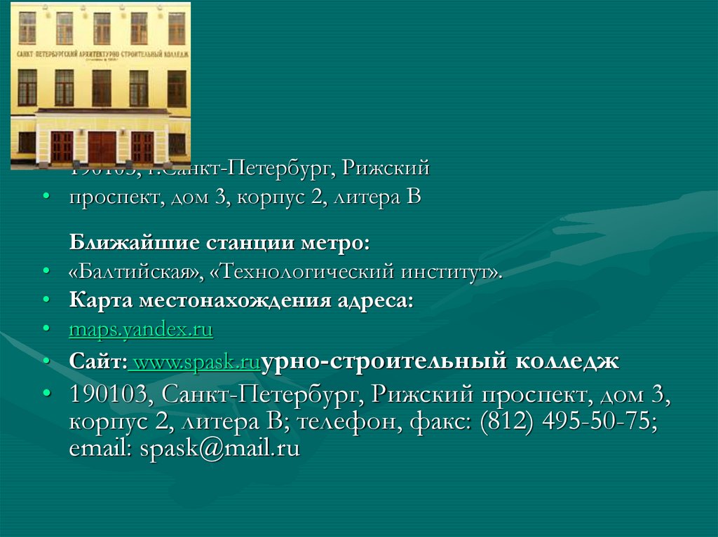 • Адрес:• 190103, г.Санкт-Петербург, Рижский