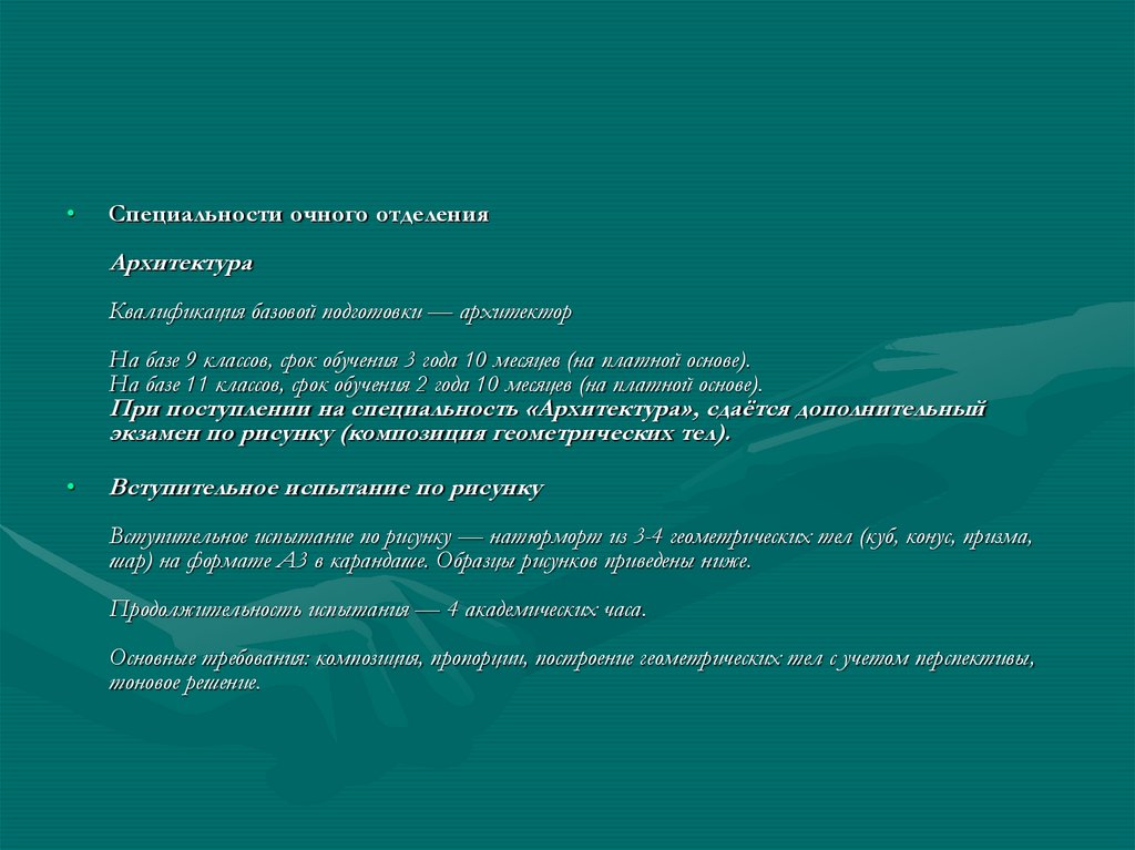 • Вступительные экзаменыСрок обучения на всех специальностях 3 года 10 месяцев.