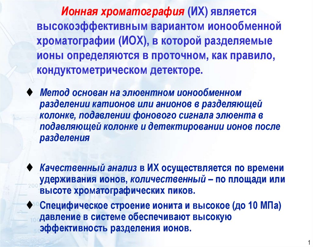 1. Ионная хроматография (ИХ) является высокоэффективным вариантом ионообменной хроматографии (ИОХ), в которой разделяемые ионы