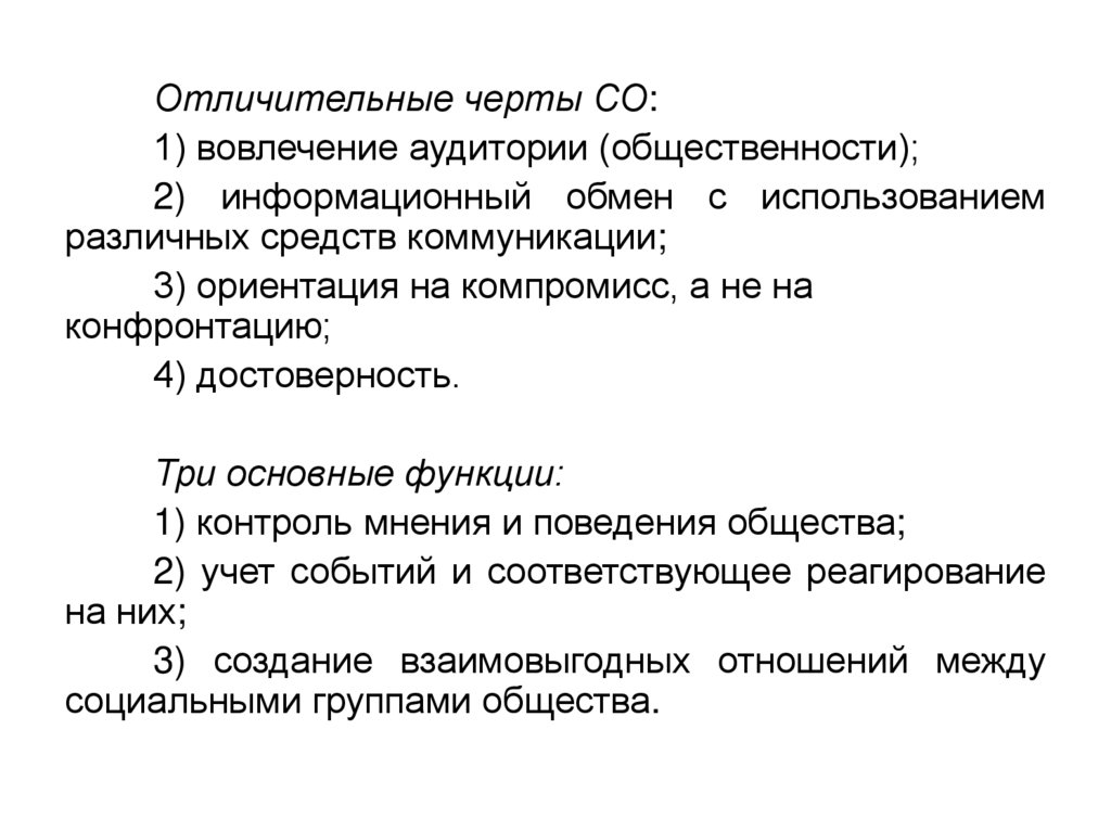 Отличительные черты СО:1) вовлечение аудитории (общественности);